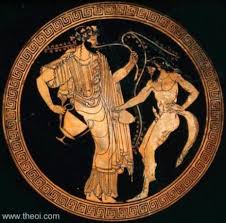 Хесиод сведочи да је увек сматран дародавцем и изумитељем вина (Хесиод, Ор. 614), а најстарија позната представа га повезује га повезује са свадбом Ахилових родитеља. У Сефорису, Дионис је приказан изврнут на леви бок док десном руком пружа пехар ка Хераклу.  Представа приказује да он односи победу у конзумацији вина. Ово, према Таталовићу, може да има паралелу у приказивању месијанског вина према побеђеној води закона. Он додаје да постоји још једна димензија будући да Христос претвара воду у вино, показујући се тако моћнијим од Диониса.